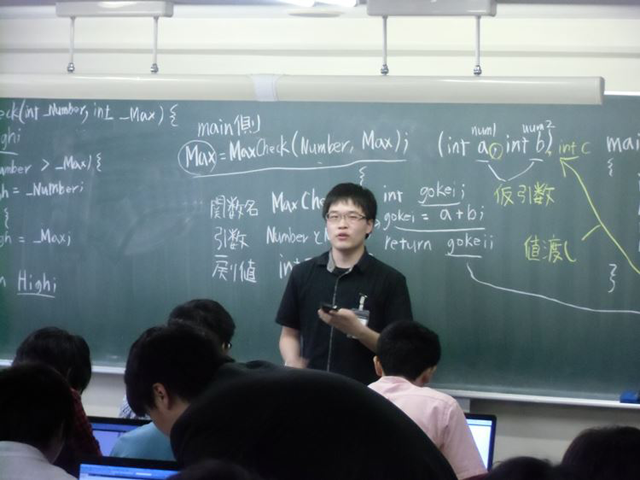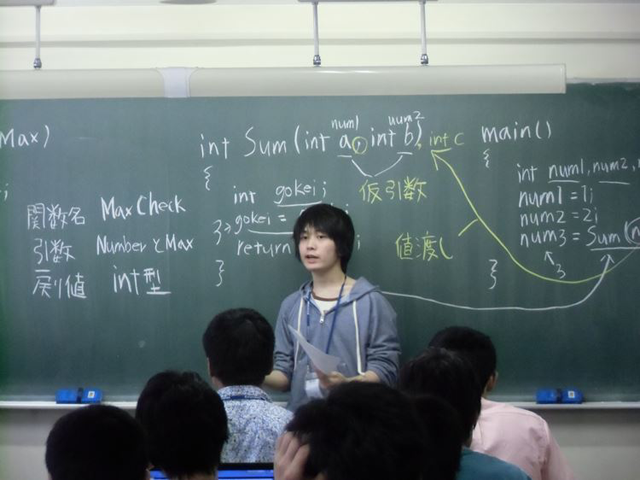 黒板を使って関数の仕組みを説明し、実際にプログラミングを行ってもらいましたが、
