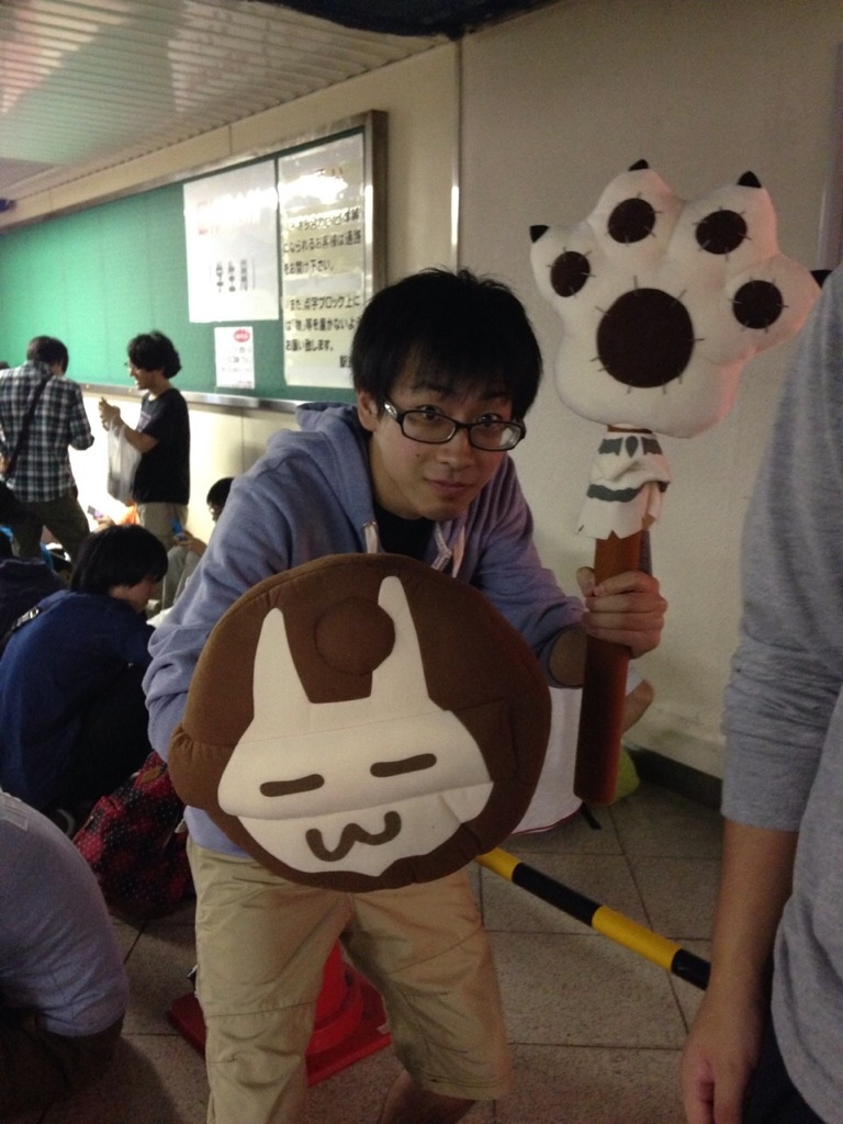 ↑モンスターハンターの「にゃんにゃん棒」を装備する嶋根君