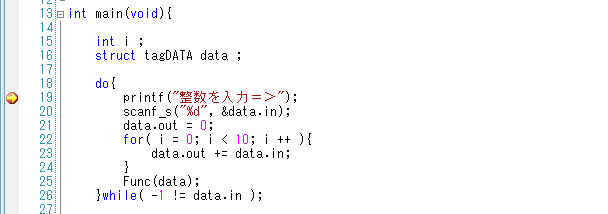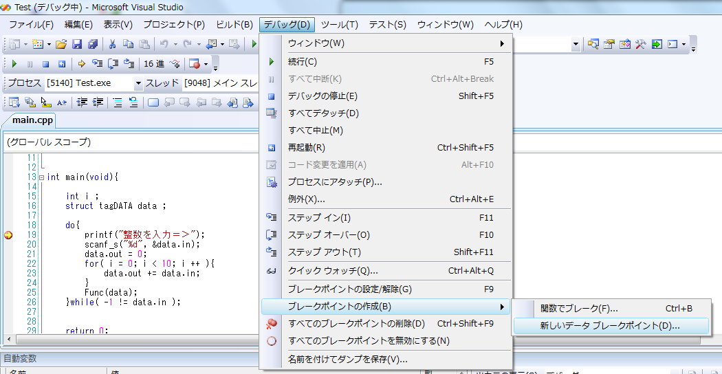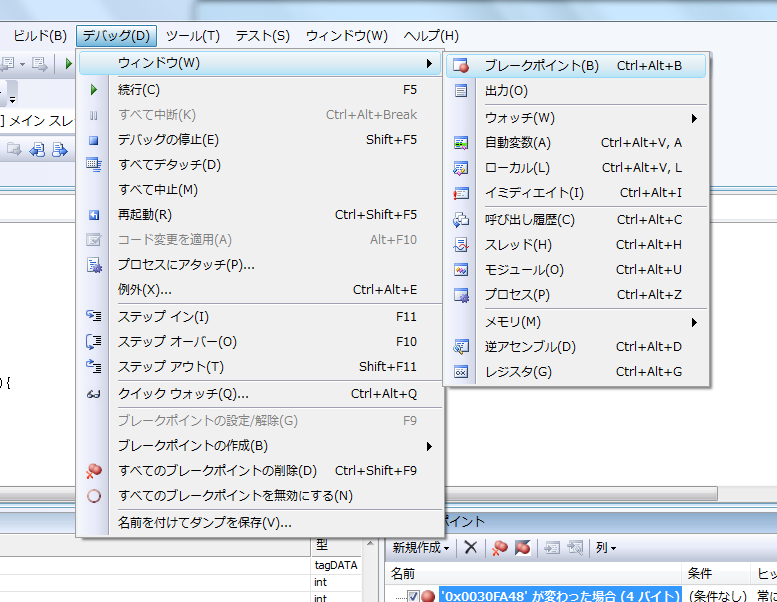 使い方ですが、まず適当なところにブレークポイントを置いて、F5実行します