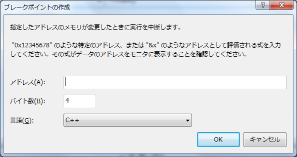 [デバッグ]→[ブレークポイントの作成]→[新しいデータブレークポイント]と進みます