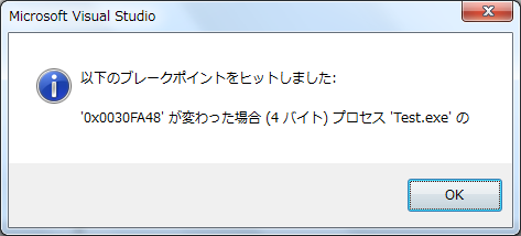 そうすると、こんなウィンドウがでてきて、監視していた変数の値が変更されたことを教えてくれます