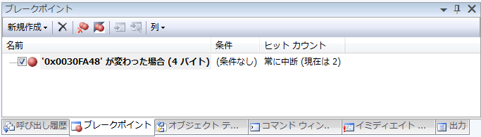 ない人は、[デバッグ]→[ウィンドウ]→[ブレークポイント]で出すことができます