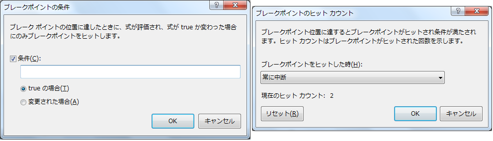 条件を設定するには、ブレークポイントを選んで右クリックで、条件を選択。ブレークポイントで中断する条件を設定するには、ヒットカウンタを選択します