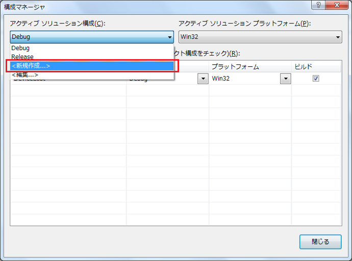 そしたら、こんなウィンドウがでるので、[アクティブソリューションの構成]の[新規作成]を選びます