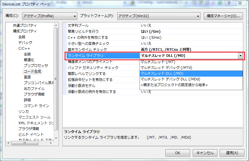 ただ、これだけだとたぶんDebugと同じになるので、プロジェクトのプロパティのC/C++のコード生成のランタイムライブラリが『マルチスレッドデバッグDLL』になっている場合は、『マルチスレッドDLL』に変更してください