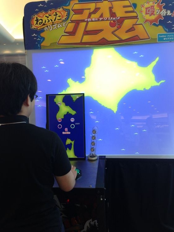 ディスプレイの真ん中にある輪と北海道からの攻撃(弾?)が重なるときに対応するボタンを押すことで青森から北海道へ攻撃することが出来ます。(太鼓の達人的な)