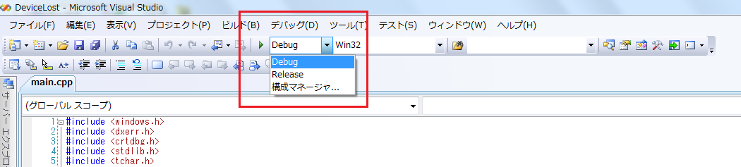 VisualStudioの上のツールバーのとこに、DebugとReleaseと構成マネージャってのがあると思います(画像の赤枠の部分)
