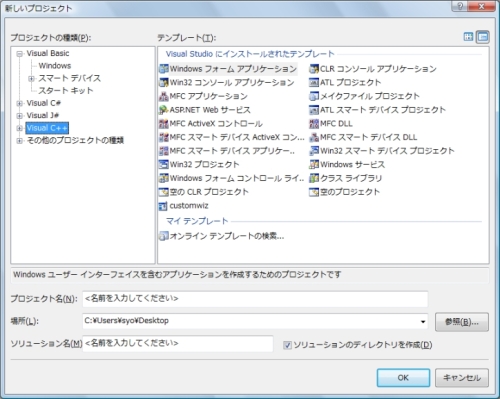 左のウインドウ「プロジェクトの種類」から「Visual C++プロジェクト」を選びます。